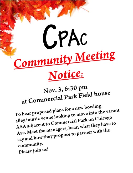 Categories Uncategorized Don’t Forget – Community Meeting Wed, 11/3 6:30pm Post author By CPAC Post date November 2, 2010 No Comments on Don’t Forget – Community Meeting Wed, 11/3 6:30pm Help us reach other neighbors and share this:Tweet Click to email a link to a friend (Opens in new window) Email More Click to print (Opens in new window) Print Click to share on Reddit (Opens in new window) Reddit Share on Tumblr Click to share on WhatsApp (Opens in new window) WhatsApp Like Loading... ← Halloween Party Saturday at Commercial Park! → Community Meeting 11/16 6:30pm no comments please
