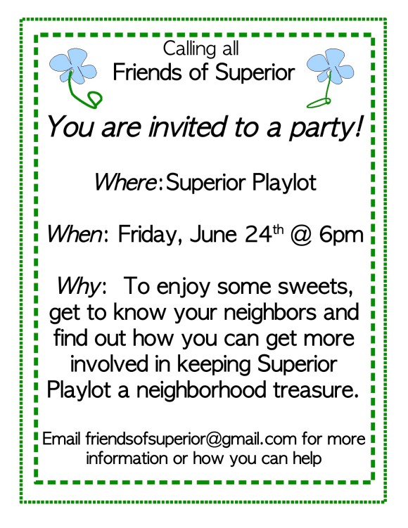 Categories Events Superior Playlot Party June 24 Post author By CPAC Post date June 19, 2011 No Comments on Superior Playlot Party June 24 Help us reach other neighbors and share this:Tweet Click to email a link to a friend (Opens in new window) Email More Click to print (Opens in new window) Print Click to share on Reddit (Opens in new window) Reddit Share on Tumblr Click to share on WhatsApp (Opens in new window) WhatsApp Like Loading... ← CPAC Meeting Tuesday June 21 → Help with Kid Fest – July 9 & 10 no comments please