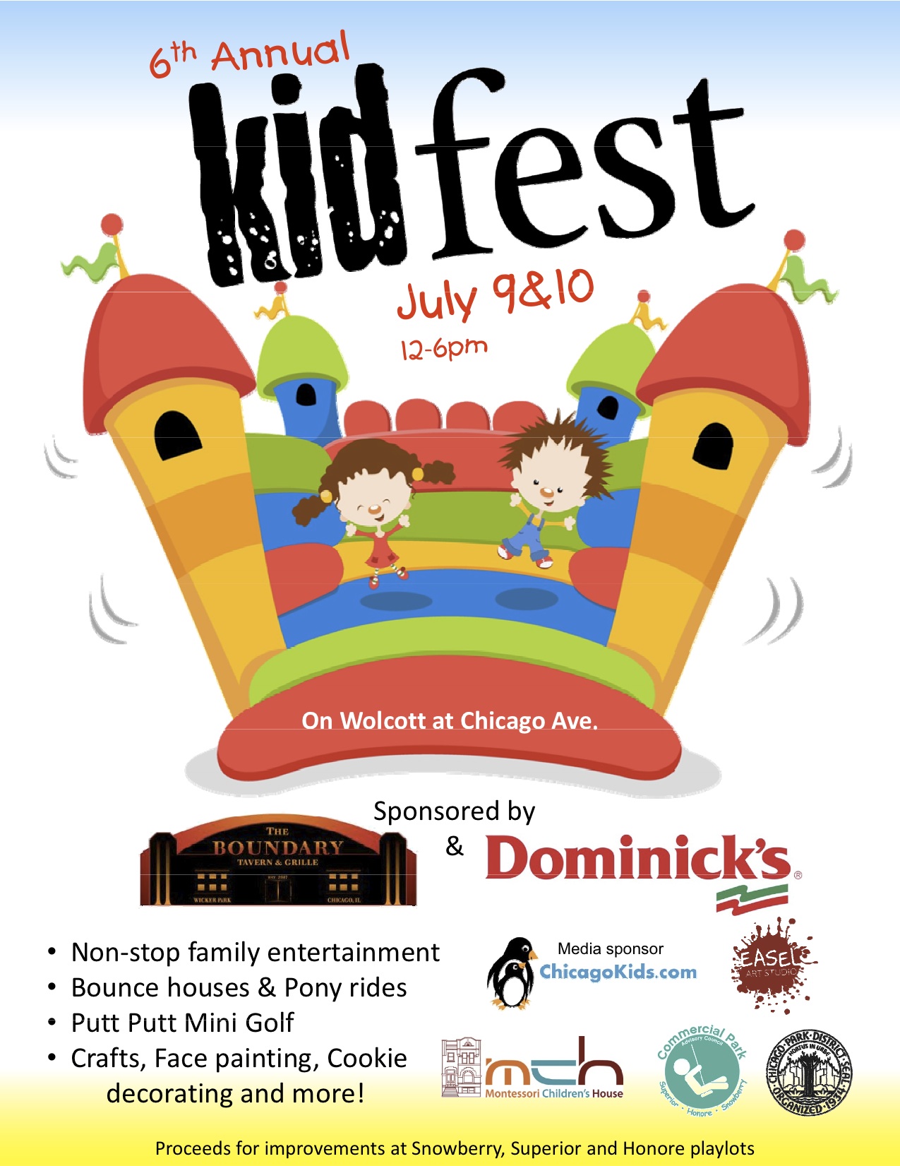 Join us for the 6th annual Kids Fest held in conjunction with West Fest July 9 & 10, Noon to 6 pm — located on Wolcott Ave at Chicago Ave. A jammed packed two-day family fun event. Come enjoy entertainment on the ‘Boundary Tavern & Grille’ family stage or take in a round of mini-golf, or enjoy bounce houses, pony rides, face painters, games, crafts and lots more.