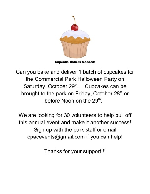 Commercial Park will again host a Halloween Party for the community on October 29. The party will run from 2 – 3:15pm, with a kids’ costume parade beginning from the park at 3pm. Please plan to attend! The event will feature activities for kids, cupcakes and other treats, a costume room as well as the costume parade.