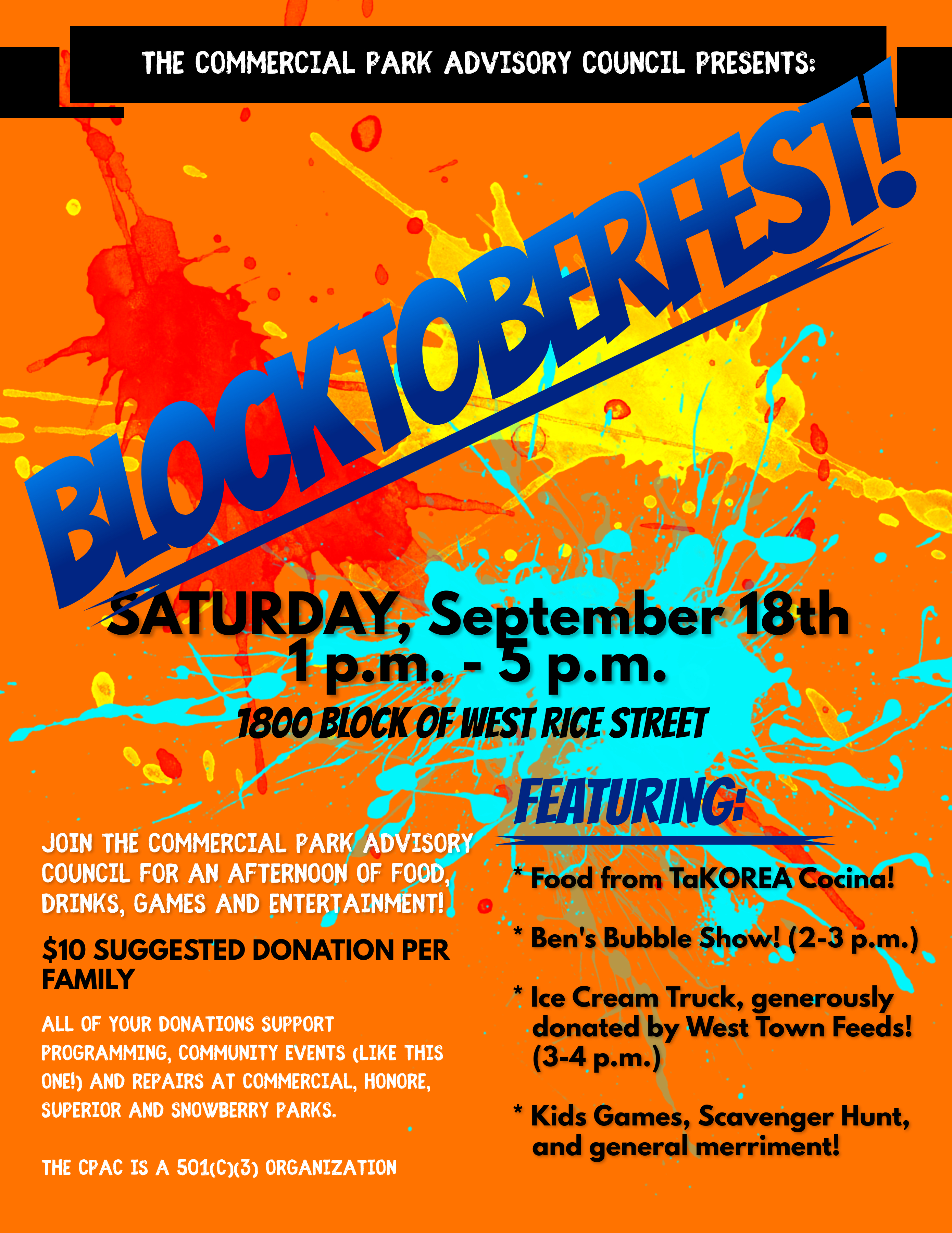 Categories Events BLOCKTOBERFEST! Saturday, September 18th, 1- 5 p.m. @ Commercial Park and Rice Street Post author By CPAC Post date September 10, 2021 No Comments on BLOCKTOBERFEST! Saturday, September 18th, 1- 5 p.m. @ Commercial Park and Rice Street The poster makes it official. See you there! Help us reach other neighbors and share this:Tweet Click to email a link to a friend (Opens in new window) Email More Click to print (Opens in new window) Print Click to share on Reddit (Opens in new window) Reddit Share on Tumblr Click to share on WhatsApp (Opens in new window) WhatsApp Like Loading... ← BLOCKTOBERFEST! SATURDAY, SEPT. 18th, 1-5 p.m., COMMERCIAL PARK AND RICE STREET! → Commercial Park Advisory Council General Meeting, Tuesday, October 12th, 6:30 p.m. no comments please